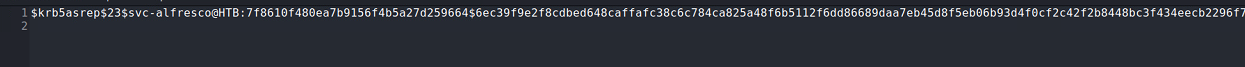 $krb5asrep$23$svc-alfresco@HTB:7f8610f480ea7b9156f4b5a27d259664$6ec39f9e2f8cdbed648caffafc38c6c784ca825a48f6b5112f6dd86689daa7eb45d8f5eb06b93d4f0cf2c42f2b8448bc3f434eecb2296f7866a783302ef30be8874089435e5701eb860221efe5f043c75308b946370c7675da35629368f9b2c9ae33c7ba5c1ce4c8e2c9e49ada72ea2fa41c16706f5fe97e7154a3ddf83d4a5efb8e8410edf0a3784bb9356b60b9a650c617c3355aac87e00690f5515512958e135c264c4bc635aca826ac744739fef58661da1f96db684c2a9d05c93b972ebdbc80a3b21fb01c72640abe85b7f3416211347f95283d35be03f855b90bb9373b